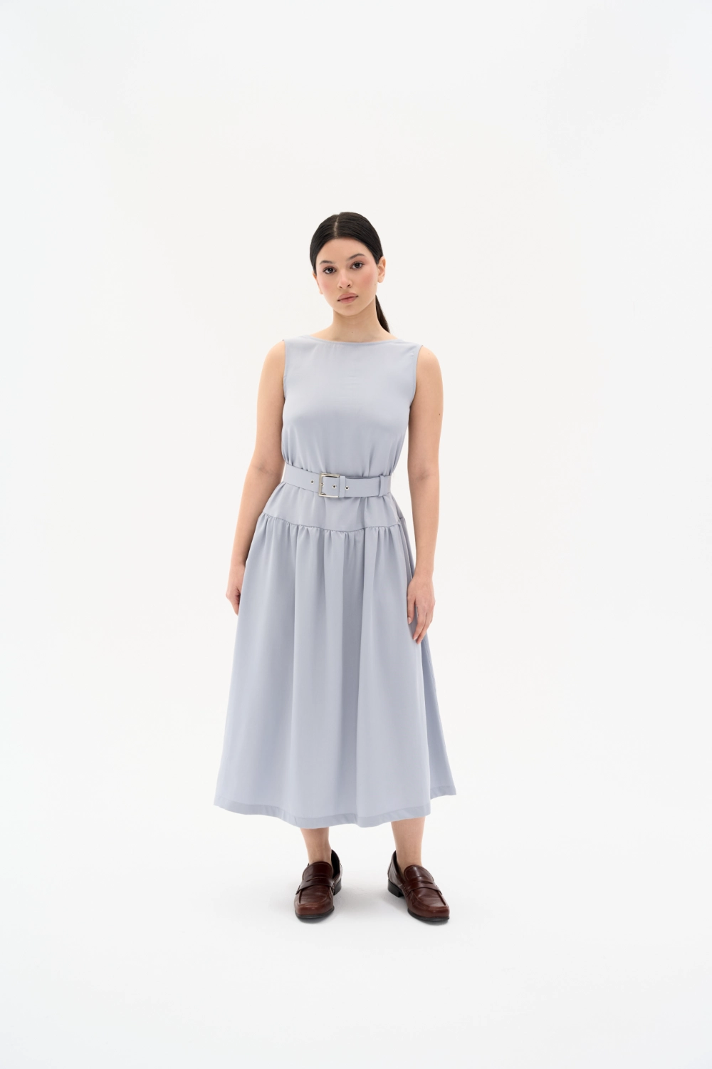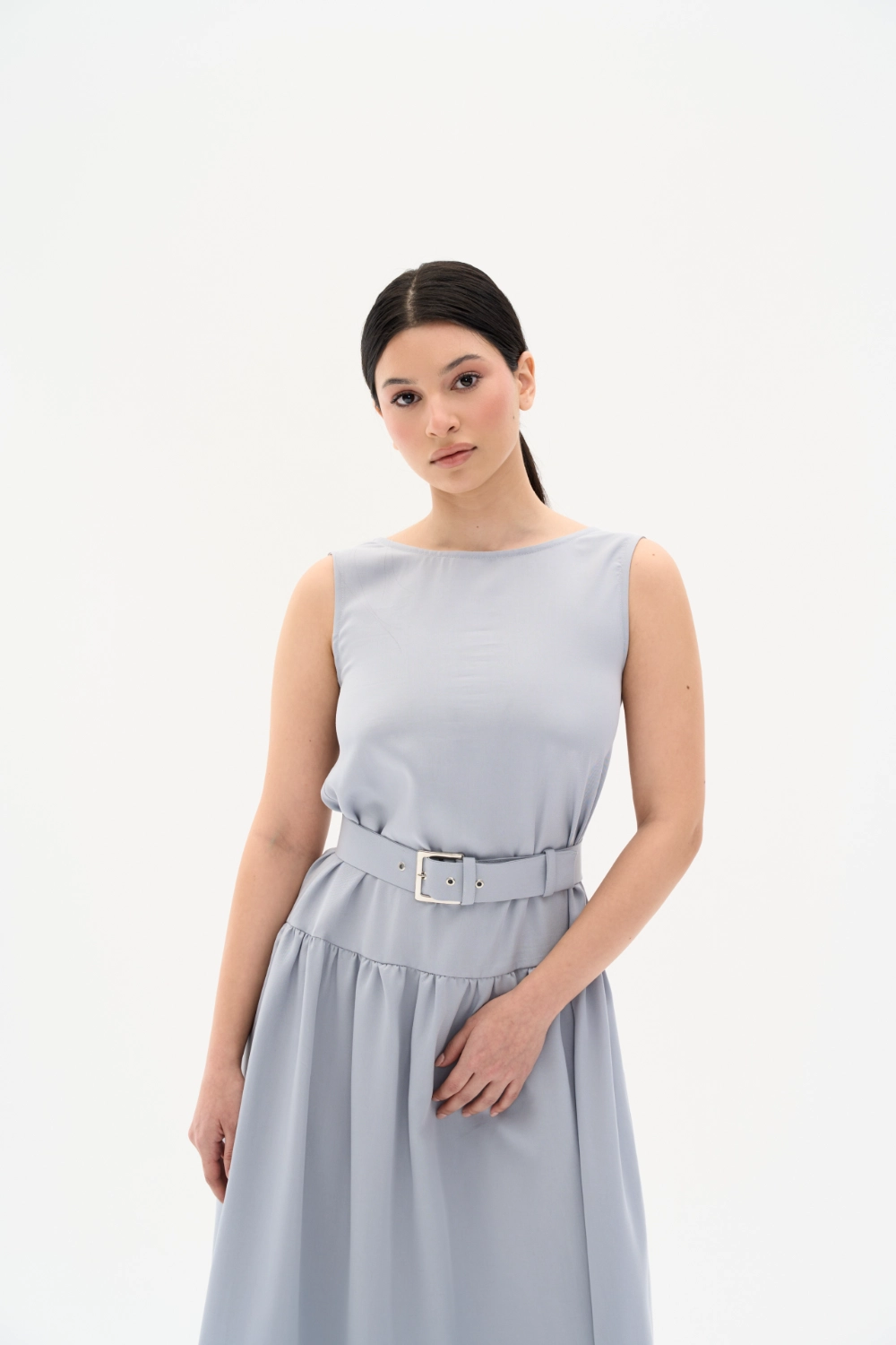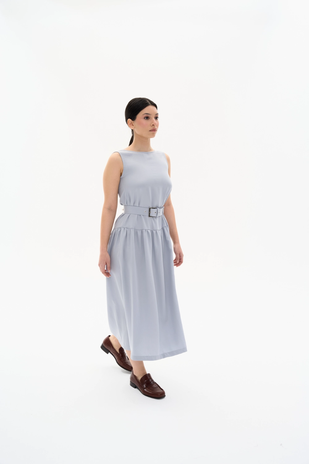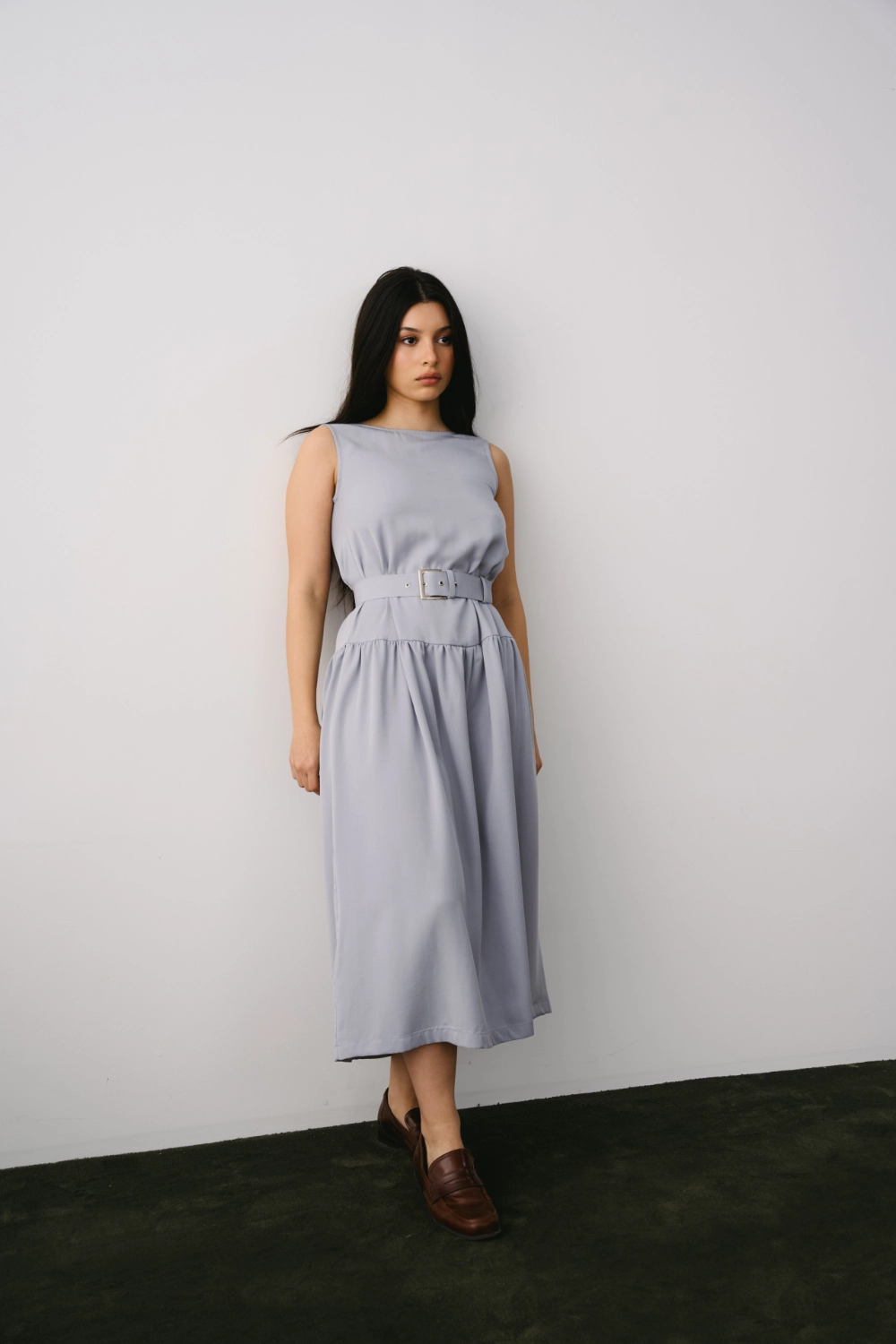 Günün her anında zarafeti ve konforu bir arada hissetmek isteyenler için tasarlanan bu mavi-gri midi elbise, Tencel kumaşın dökümlü yumuşaklığını taşıyor. Minimalist sıfır yaka tasarımı ve kendi kumaşından üretilen özel tokalı kemeriyle beli vurgulayan modern bir silüet sunuyor. Nefes alan ve ipeksi dokusuyla yaz aylarında serinlik sağlayan bu elbise, gardırobunuzun en joker parçalarından biri olacak. İster günlük sandaletlerle, ister şık topuklularla kombinleyin.
