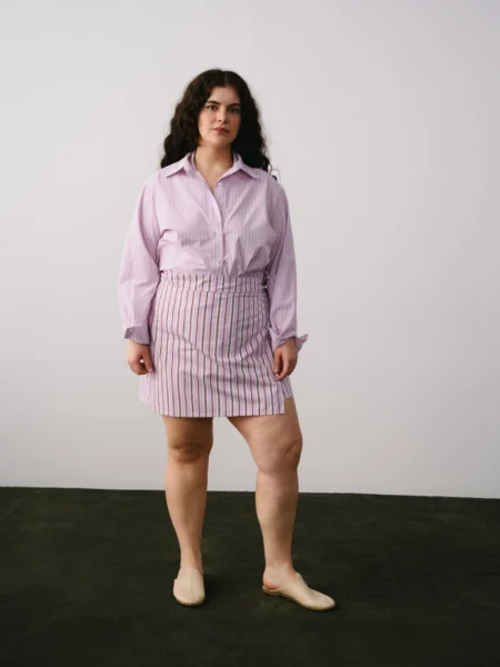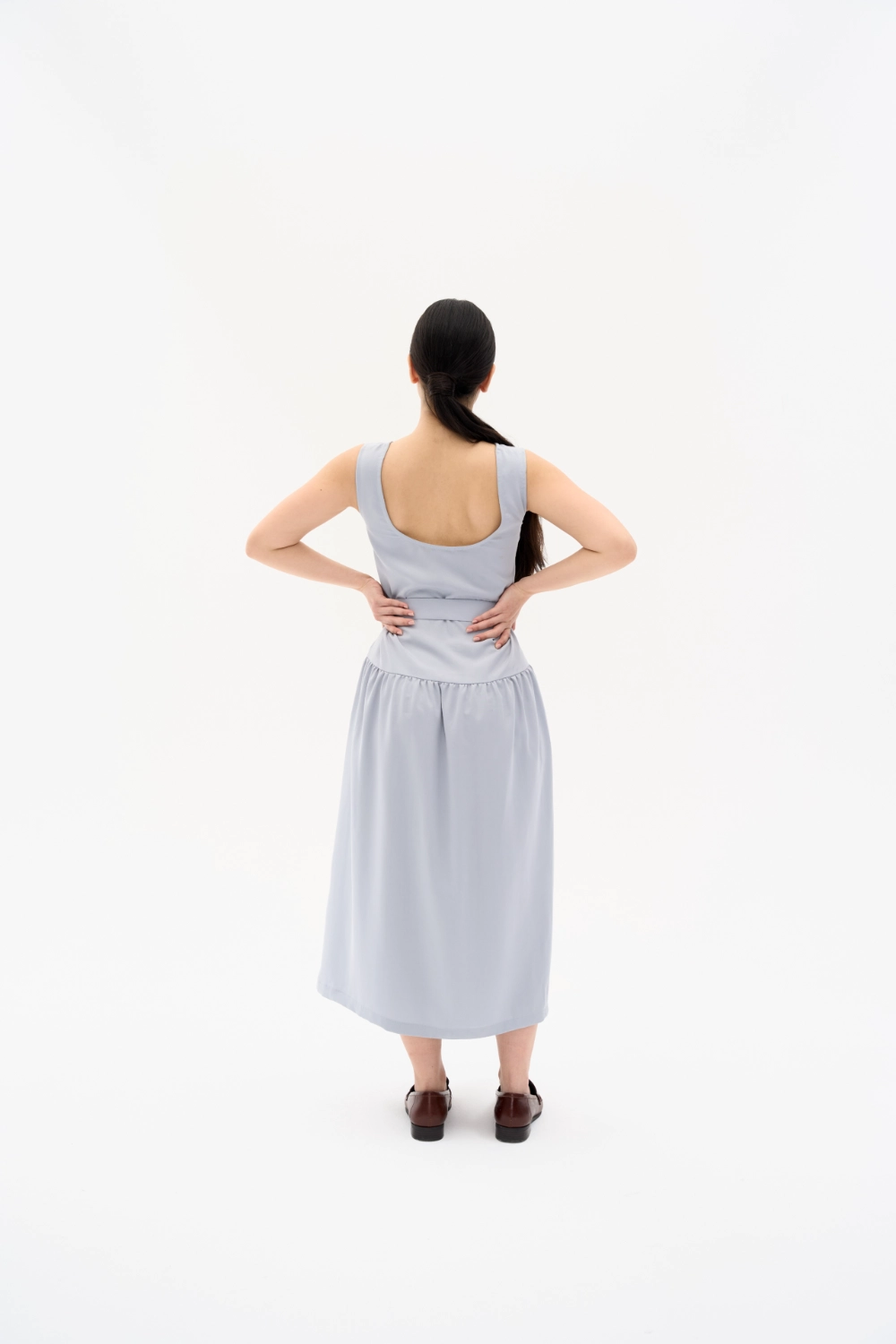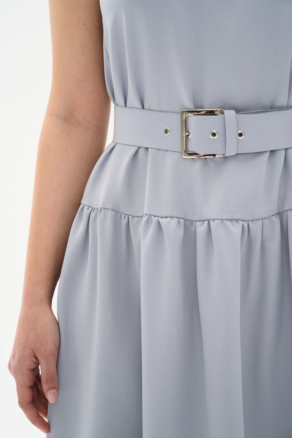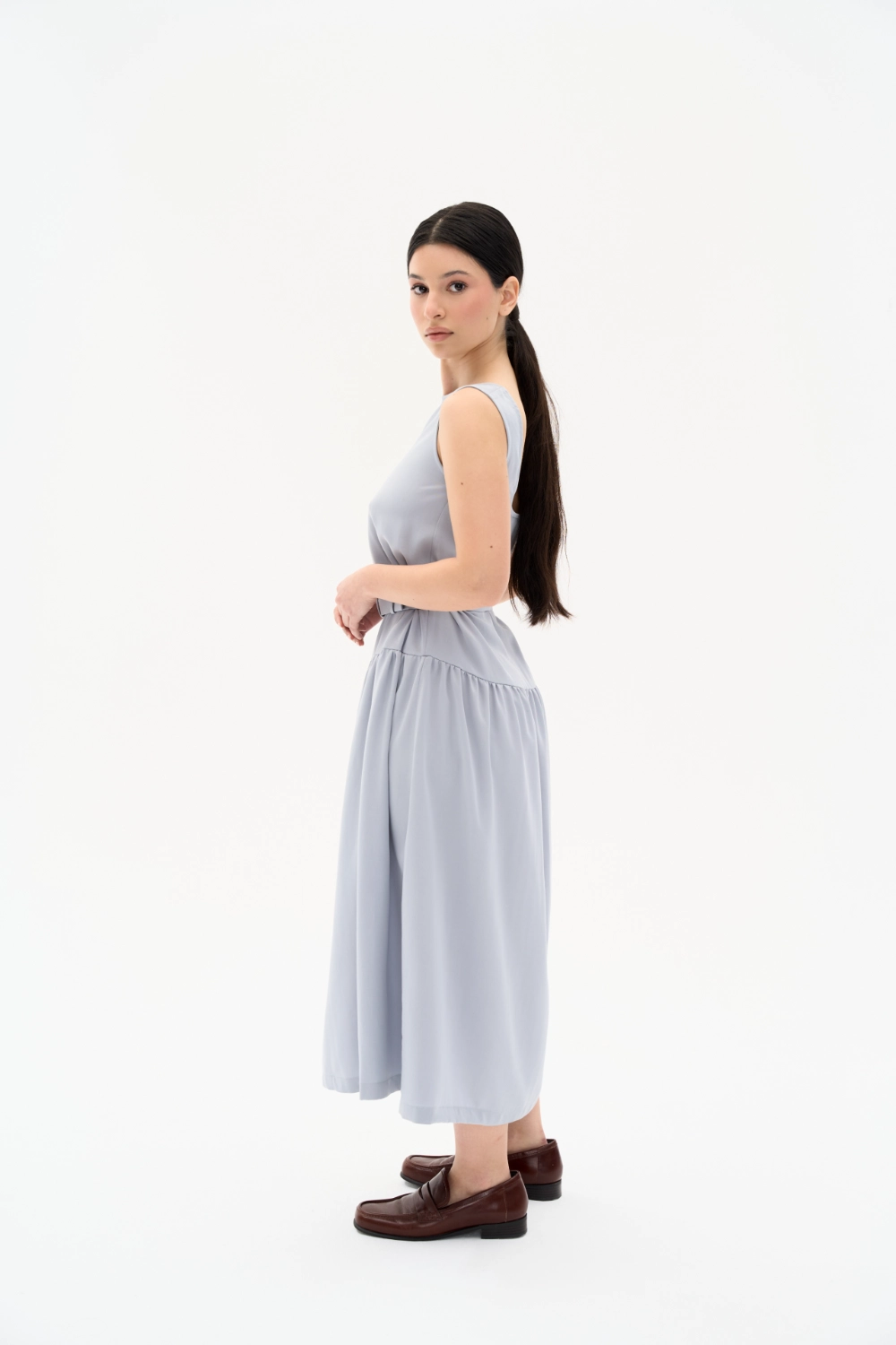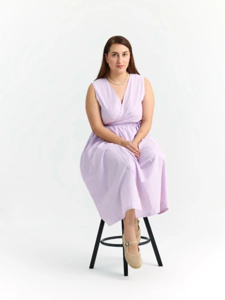 Günün her anında zarafeti ve konforu bir arada hissetmek isteyenler için tasarlanan bu mavi-gri midi elbise, Tencel kumaşın dökümlü yumuşaklığını taşıyor. Minimalist sıfır yaka tasarımı ve kendi kumaşından üretilen özel tokalı kemeriyle beli vurgulayan modern bir silüet sunuyor. Nefes alan ve ipeksi dokusuyla yaz aylarında serinlik sağlayan bu elbise, gardırobunuzun en joker parçalarından biri olacak. İster günlük sandaletlerle, ister şık topuklularla kombinleyin.