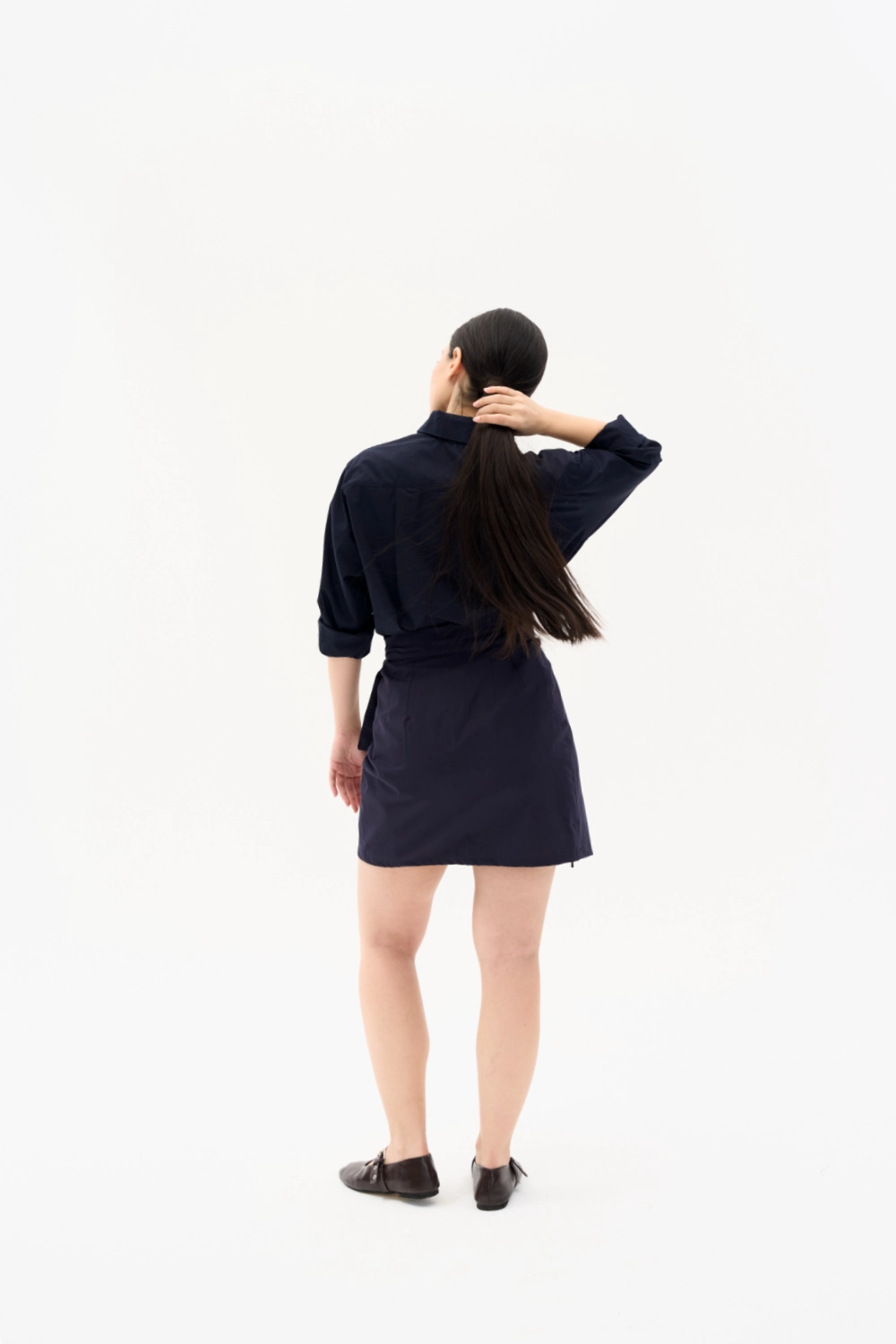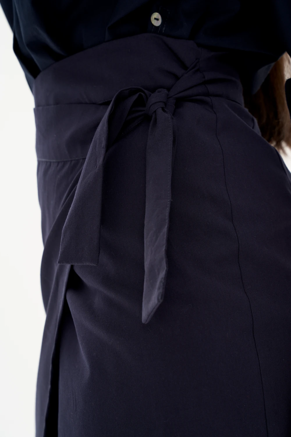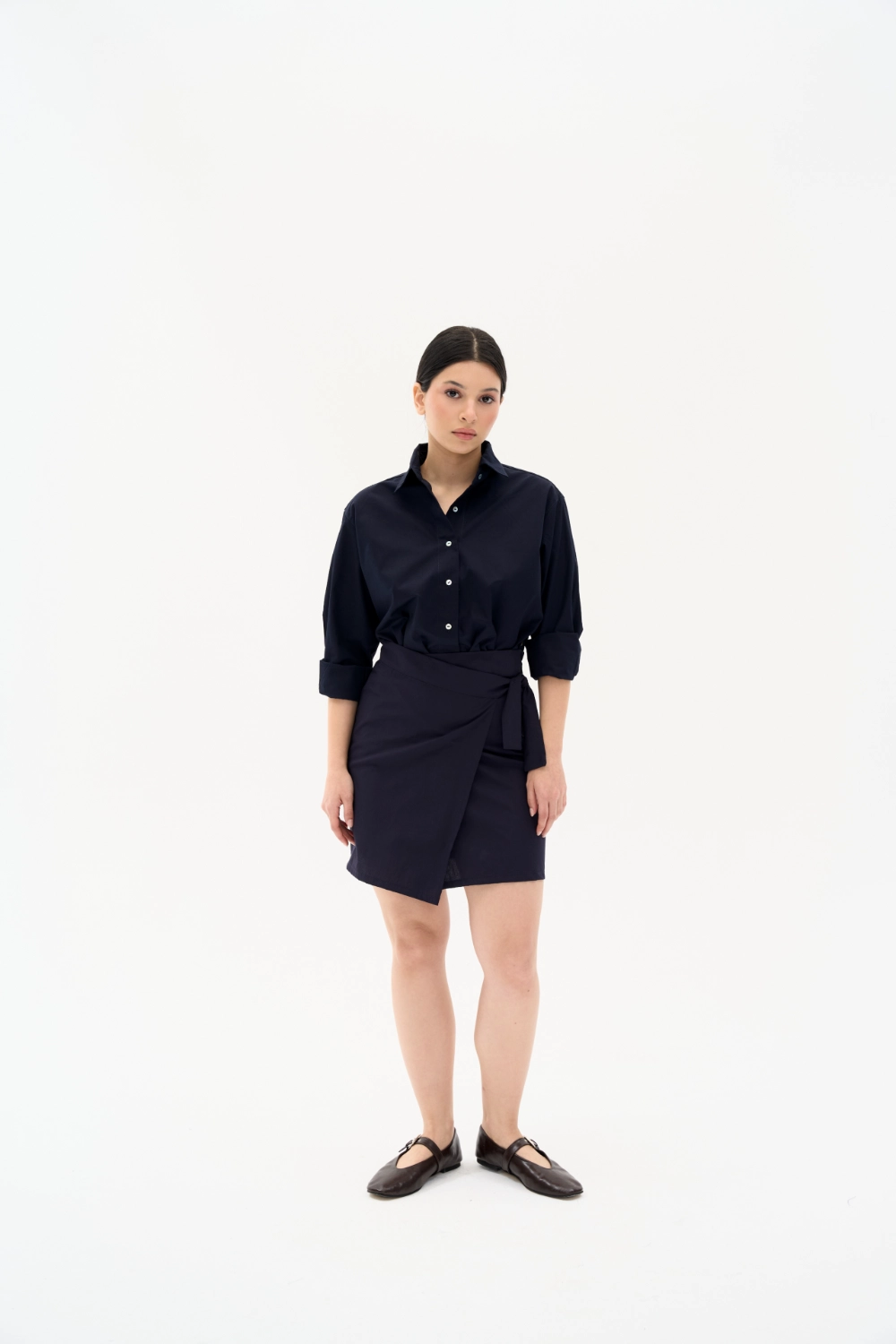Anvelop kesim uzun etek, yaz aylarının şehirde çaba sarfetmeden giyinme pratiğini yansıtıyor. Belden bağlama detayı, ince dökümlü %100 pamuk kumaşı ve anvelop kesimi ile bedene mükemmel bir uyum sağlıyor.