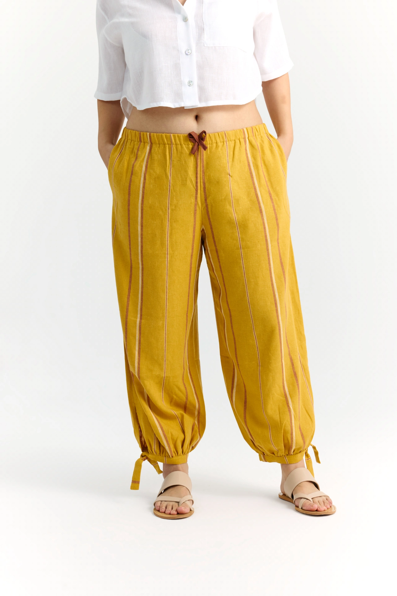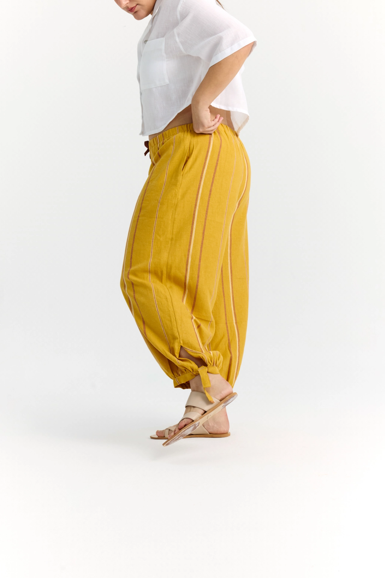 Martha Pants, yumuşak dokulu viskon-keten karışımı kumaşı ve balon kesimiyle hem şık hem rahat bir görünüm sunar. Normal bel yapısı ve elastik beli sayesinde gün boyu konfor sağlar. Yan cepleriyle pratiklik sunarken, paçalardaki bağcıklı manşet detayı ile stilinizi tamamlar. Hafif dökümlü yapısı sayesinde yazdan sonbahara geçişte gardırobunuzun favorisi olacak.