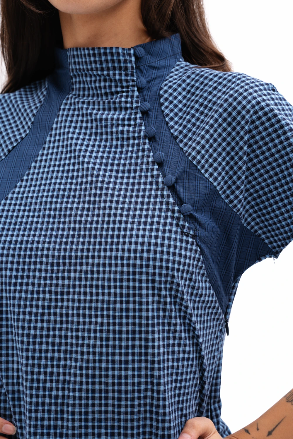 %100 pamuk poplin kumaştan üretilen bu mini elbise, dokulu kareli deseniyle enerjik bir görünüm sunar. Öndeki düğme ve gizli fermuar detaylarıyla işlevselliği zarif biçimde birleştirirken, kontrast paneller tasarıma modern bir karakter kazandırır.