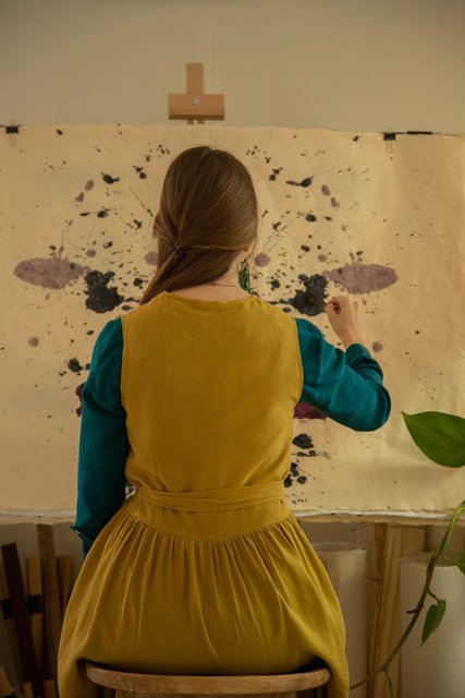 Deniz: Doğal malzemeleri keşfetmem iki sene önce Datça’da Satsuma Studio’nun eğitimine katılmamla başladı. Şehirde büyümüş bir çocuk olarak, doğa ile olan bağımı hatırlamam yalnızca dört, beş sene öncesine dayanıyor. Özellikle üniversite yıllarında zor günler geçirdiğimde kendimi hep doğanın kucağına attığımı hatırlıyorum. Bir ağaca sırtımı yaslayarak saatlerce oturduğum olurdu. O zamanlar bunu pek anlamlandıramamış ve sadece boş bulduğum insansız bir yerde vakit geçirdiğimi düşünüyordum. Şimdi fark ediyorum ki acımı dindirmek için gidilebilecek belki de en güçlü şifacıya, toprak anaya gidiyormuşum. Bunu fark ettikçe, şehirde yaşayan biri olarak, doğada bulunmak için daha çok çabalamaya ve şehrin içindeki minik doğayı keşfetmeye başladım. Bu farkındalıklarımın üzerine doğal boyama eğitimine katılmak çalışmalarım için bambaşka kapılar açtı. Kullandığım malzemelerin doğal olmasına ve yaratımlarımın ekosisteme daha az zararlı olmasına dikkat etmeye başladım. Doğada bulunmak ve gözlemlemekten aldığım keyif, doğal malzemeleri araştırmak ve toplamakla birlikte daha da çoğaldı. Doğal malzemelerle çalışmanın bana en iyi gelen yanı hazırlık sürecinin getirdiği hediyeler; Doğada olmak, onu görmek, fark etmek, dokunmak, hissetmek. Tüm bunlar öyle zengin bir deneyim sunuyor ki bu malzemelerle yaptığım resim zaten sürecin hediyesi gibi öylece ortaya dökülüyor. Daha hayatımda çok yeni olan doğal malzemeleri kullanmanın benim açımdan bir diğer önemi de bitkilerin ruhunun ve deneyimlerinin de o resme katıldığına inanmam. Bence işin büyülü bir kısmı da burası. Bunun için adil, bitkileri, ekosistemi gözeterek toplamaya önem veriyorum. Kendim toplayamadığımda da doğal boya tedarik eden markaların pigmentlerini kullanmayı tercih ediyorum. Tamamen zehirsiz, ekolojik sanat yapıyorum diyemem ancak bu yolda yeni yürümeye başlamış biri olarak elimden geldiğince hem doğayı hem de kendi yaratıcı sürecimi gözeterek ilerlemeye çalışıyorum.