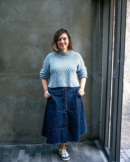 Elif wearing Agnes Pullover in sky with Füreya Skirt in navy